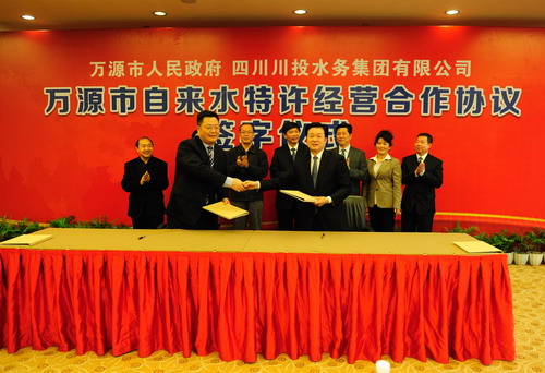 簽字儀式上,集團(tuán)公司副總經(jīng)理、川投水務(wù)集團(tuán)董事長李文志與中共萬源市委副書記、市人民政府市長吳曉勇簽訂了《萬源市城區(qū)自來水特許經(jīng)營合作協(xié)議》;川投水務(wù)集團(tuán)總經(jīng)理梁有國與萬源市國資辦主任陳守英簽訂了《民生供排水公司國有產(chǎn)權(quán)和特許經(jīng)營權(quán)轉(zhuǎn)讓協(xié)議》。根據(jù)兩個協(xié)議,川投水務(wù)集團(tuán)收購民生公司全部產(chǎn)權(quán)和萬源市城區(qū)30年自來水特許經(jīng)營權(quán),并投資建成馱山水廠,有效解決萬源市城區(qū)市民用水困難的問題。兩個協(xié)議的簽訂,標(biāo)志著川投水務(wù)集團(tuán)在項目拓展、壯大規(guī)模方面取得新的進(jìn)展。