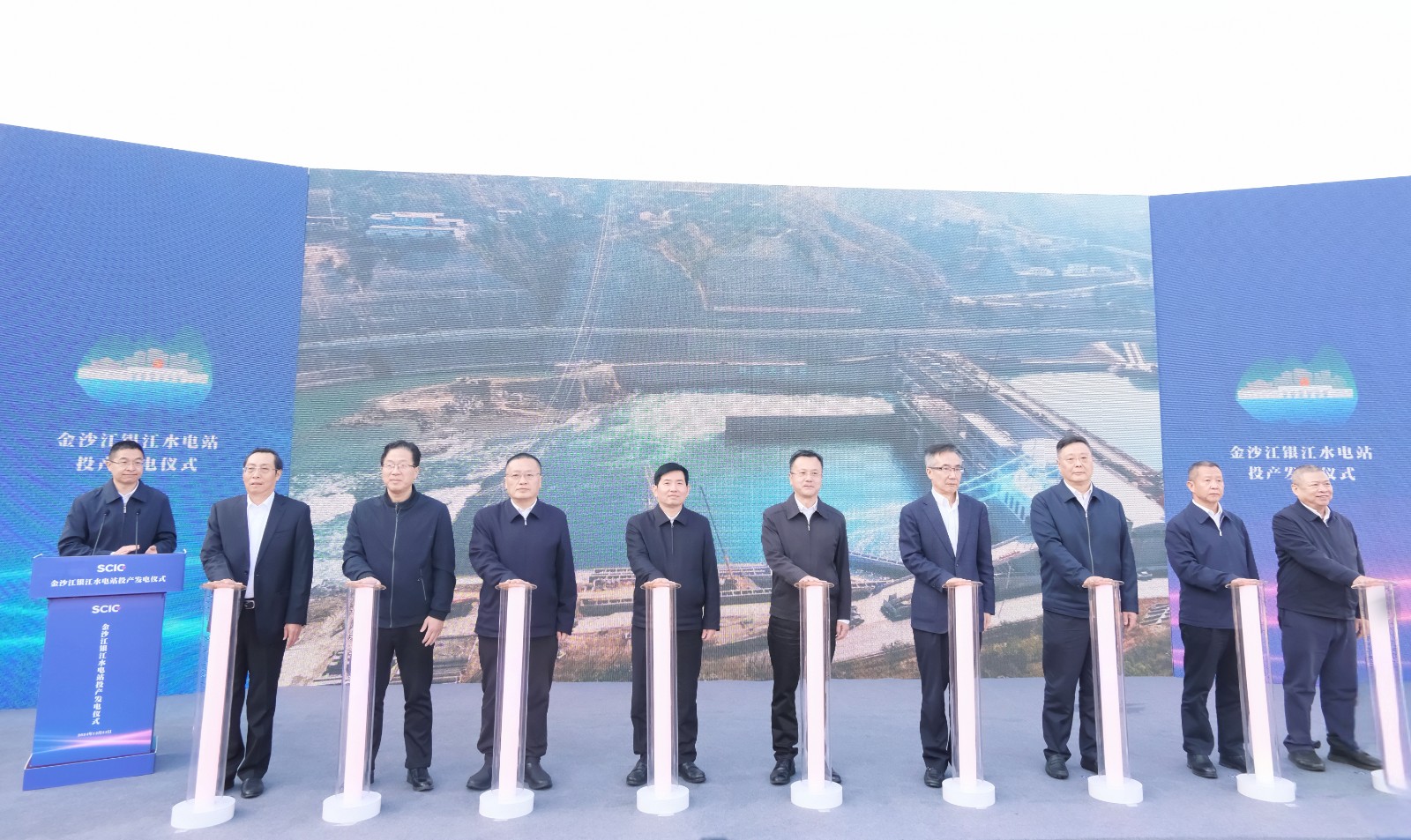 上午9時許,隨著儀式現(xiàn)場下達(dá)首臺機(jī)組開機(jī)發(fā)電指令,吳群剛、吳曉曦、范繼躍、李文志、林建國、李仁杰等領(lǐng)導(dǎo)按下啟動柱,共同啟動金沙江銀江水電站投產(chǎn)發(fā)電。